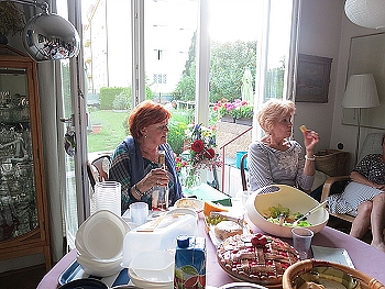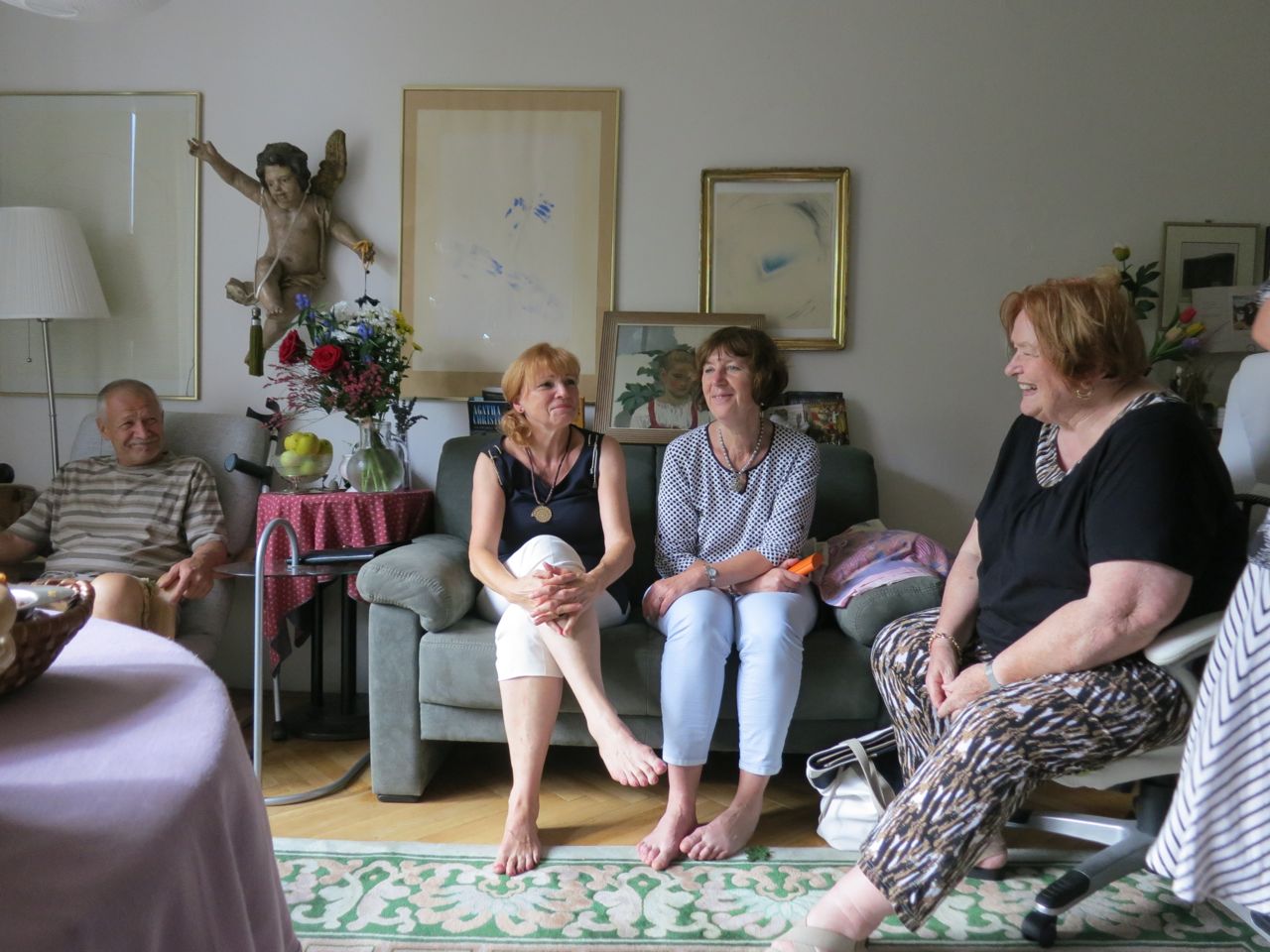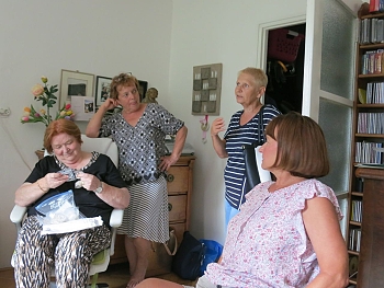 Dobu prázdnin, kdy se nescházíme v naší klubové místnosti, jsme využily k návštěvě naší členky Jany Orlíkové v jejím půvabném zahradním domečku. Pohostila nás svými tradičními kulinářskými pochoutkami a my jsme zase dodaly „vláhu“ k příjemnému povídání o věcech minulých i přítomných. Ozdobou byl nejen umělecký anděl na stěně, ale i host, sedící pod ním – náš sklářský umělec Jaromír.